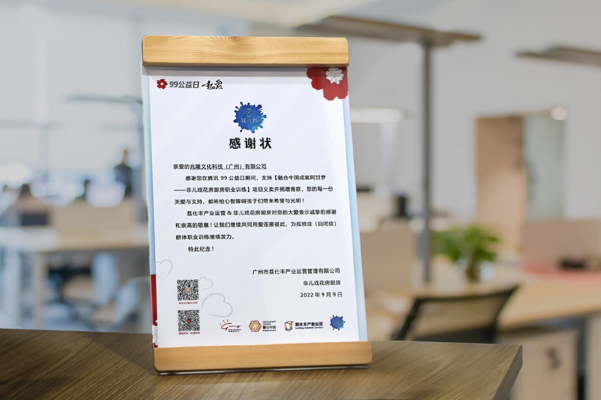 Zhaolong Culture Technology (Guangzhou) Co., Ltd. was awarded Certificate of Honor for donating to the program for helping kids with mental disorder.